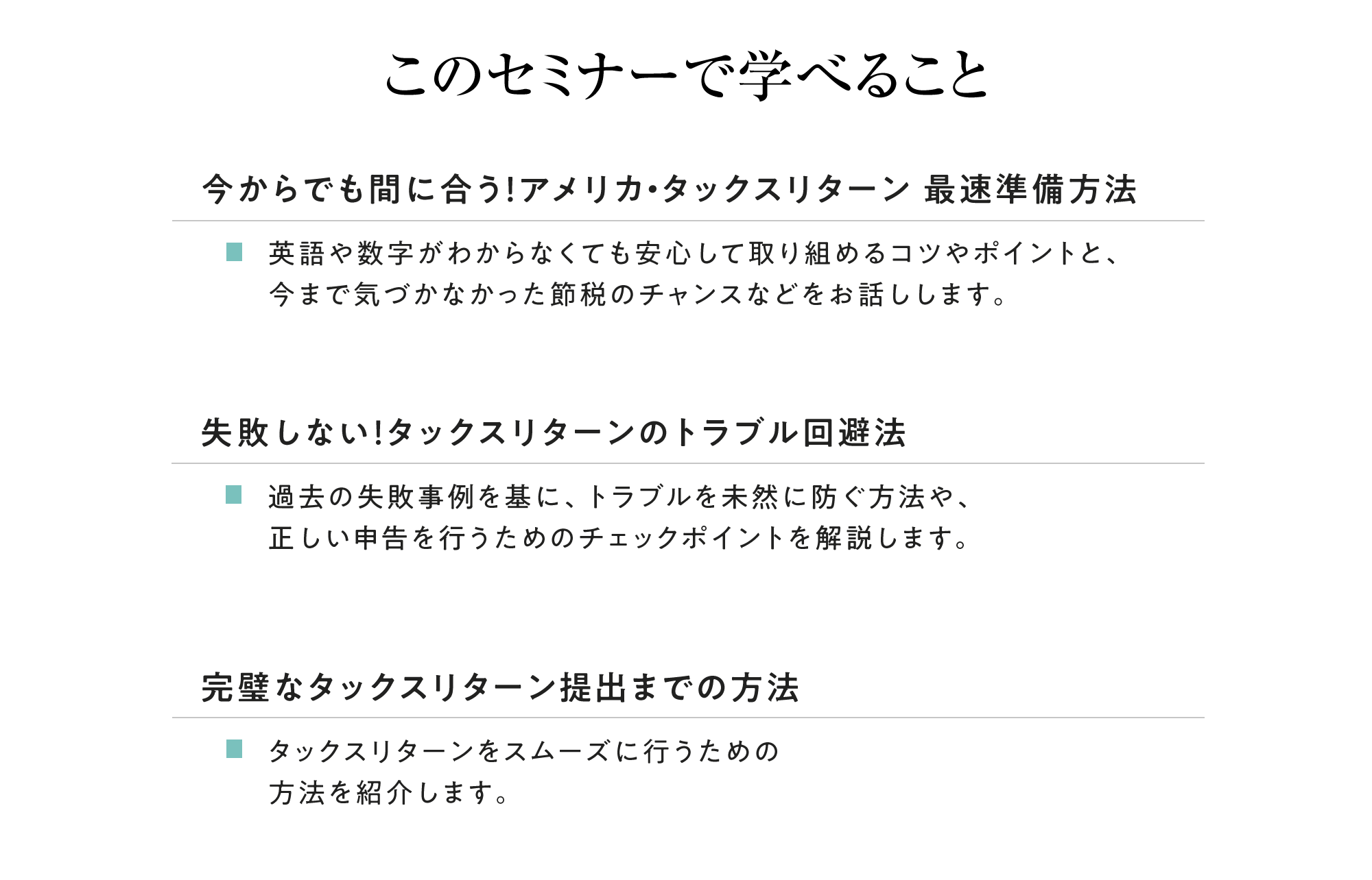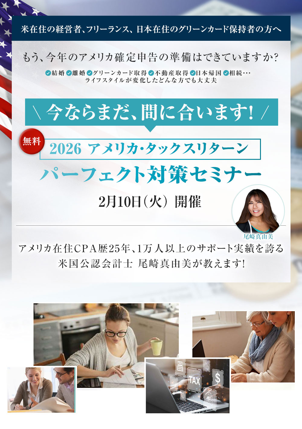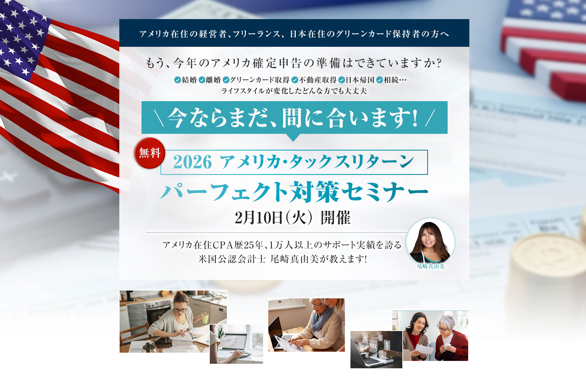 実績あるCPA(米国公認会計士)から日本語で直接、最新2026年タックスリターン情報が聞ける。