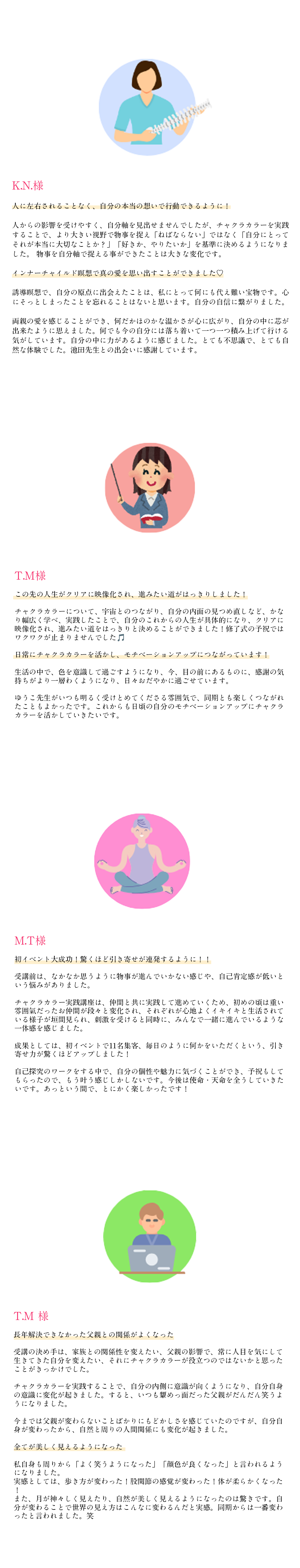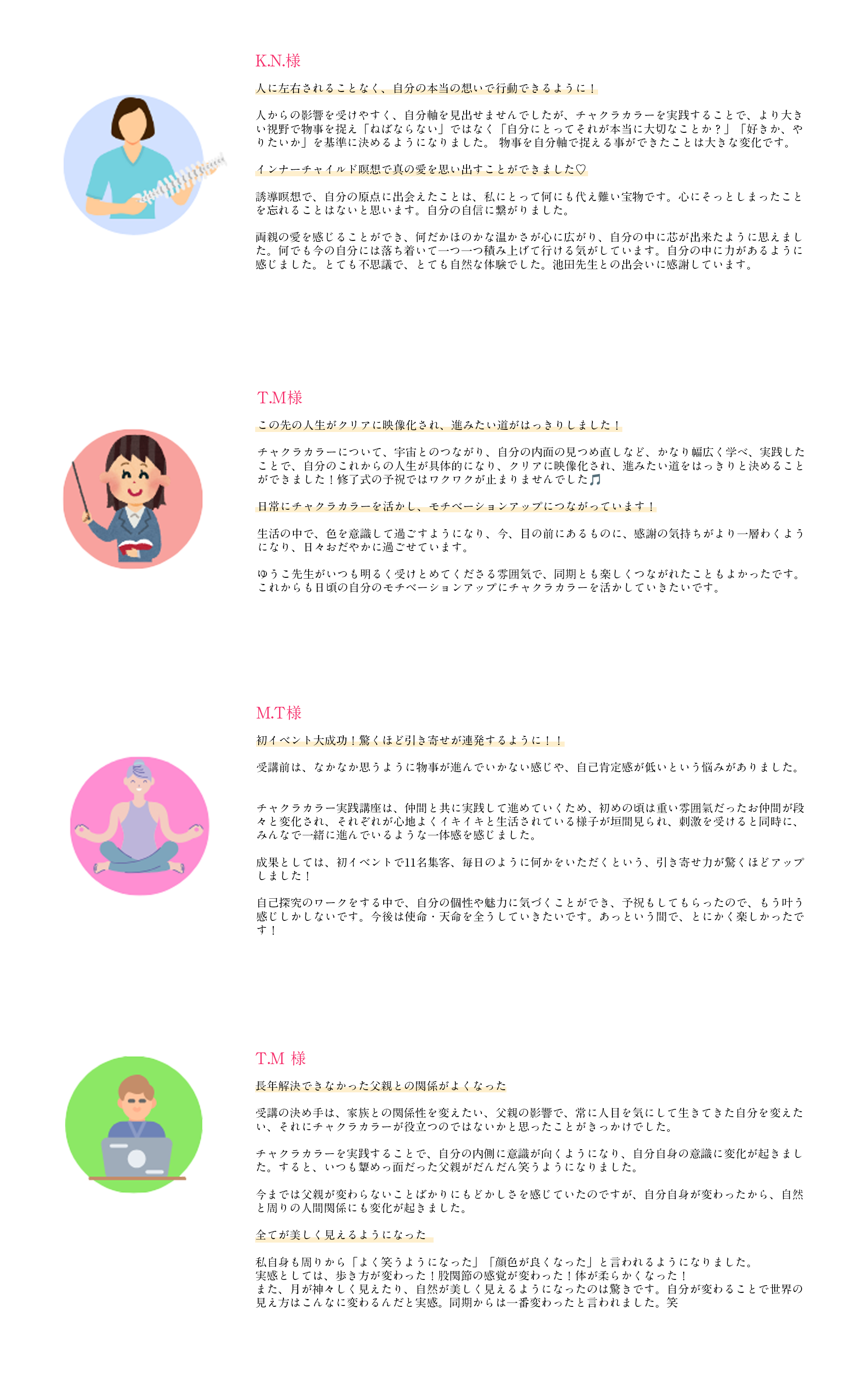 現在は、「自分色の花を咲かせよう」をテーマに、宇宙のフリーエネルギーを活用した独自のメソッドで、7つのチャクラを癒すことで、眠っている才能や魅力を呼び覚まし、 本来の自分を解き放つサポートに尽力している。
