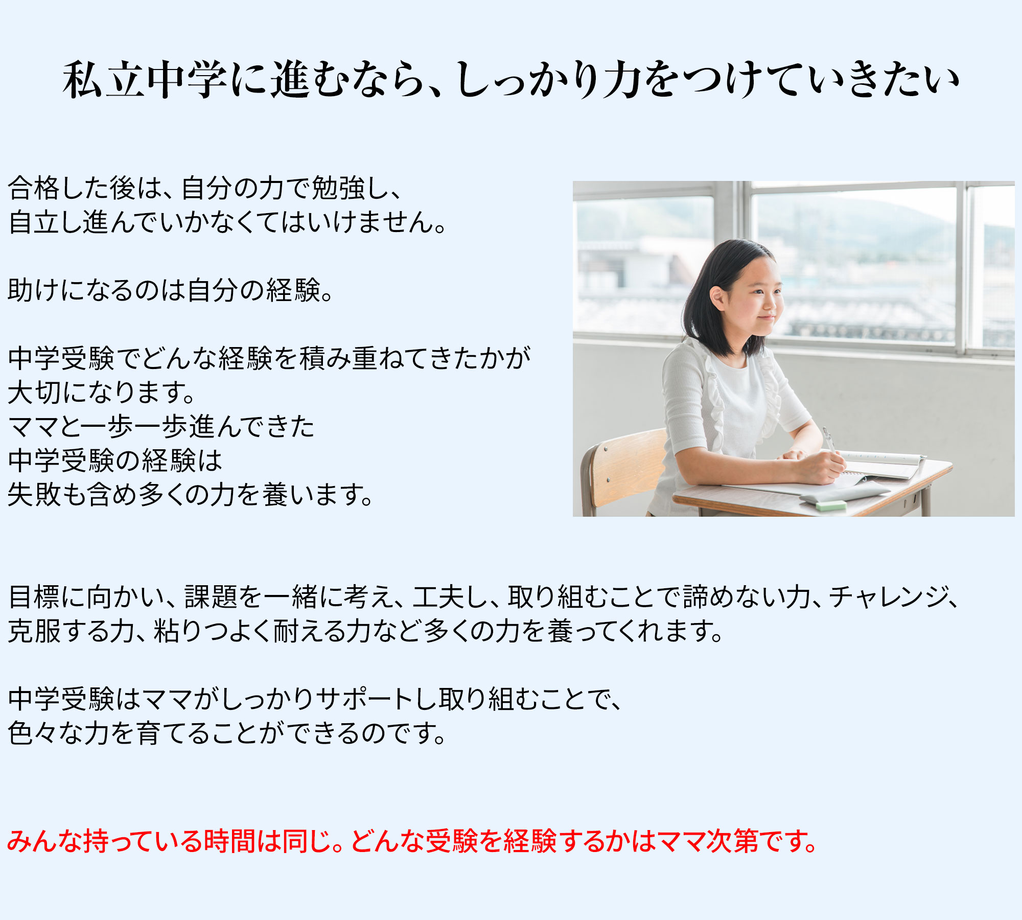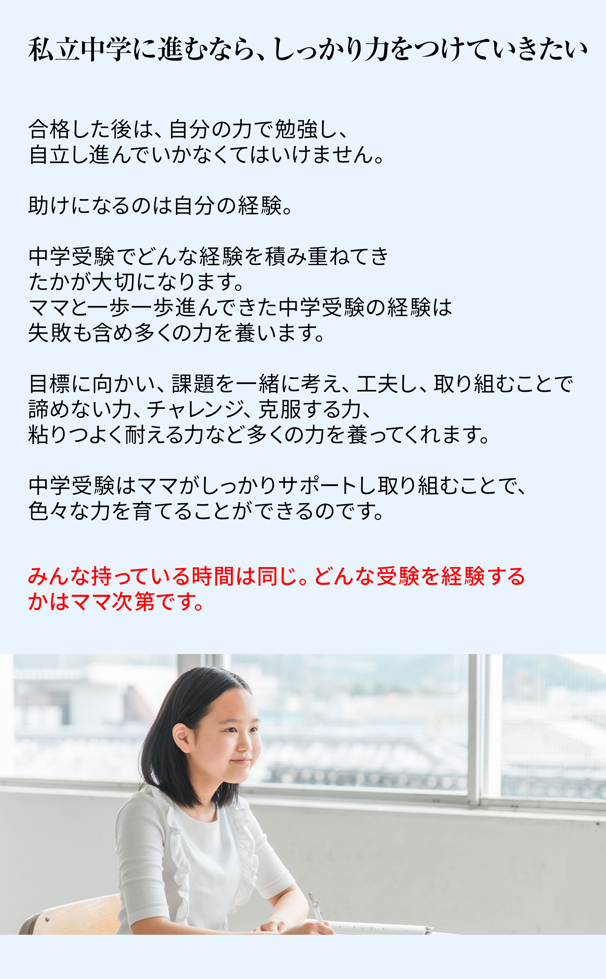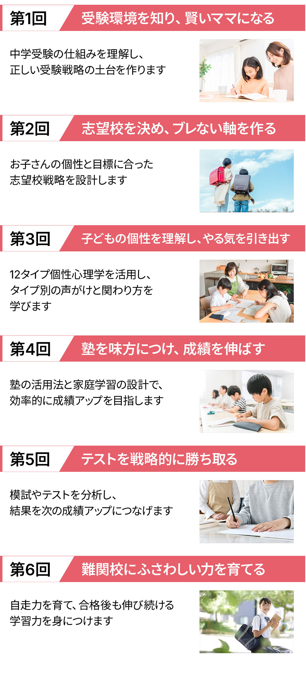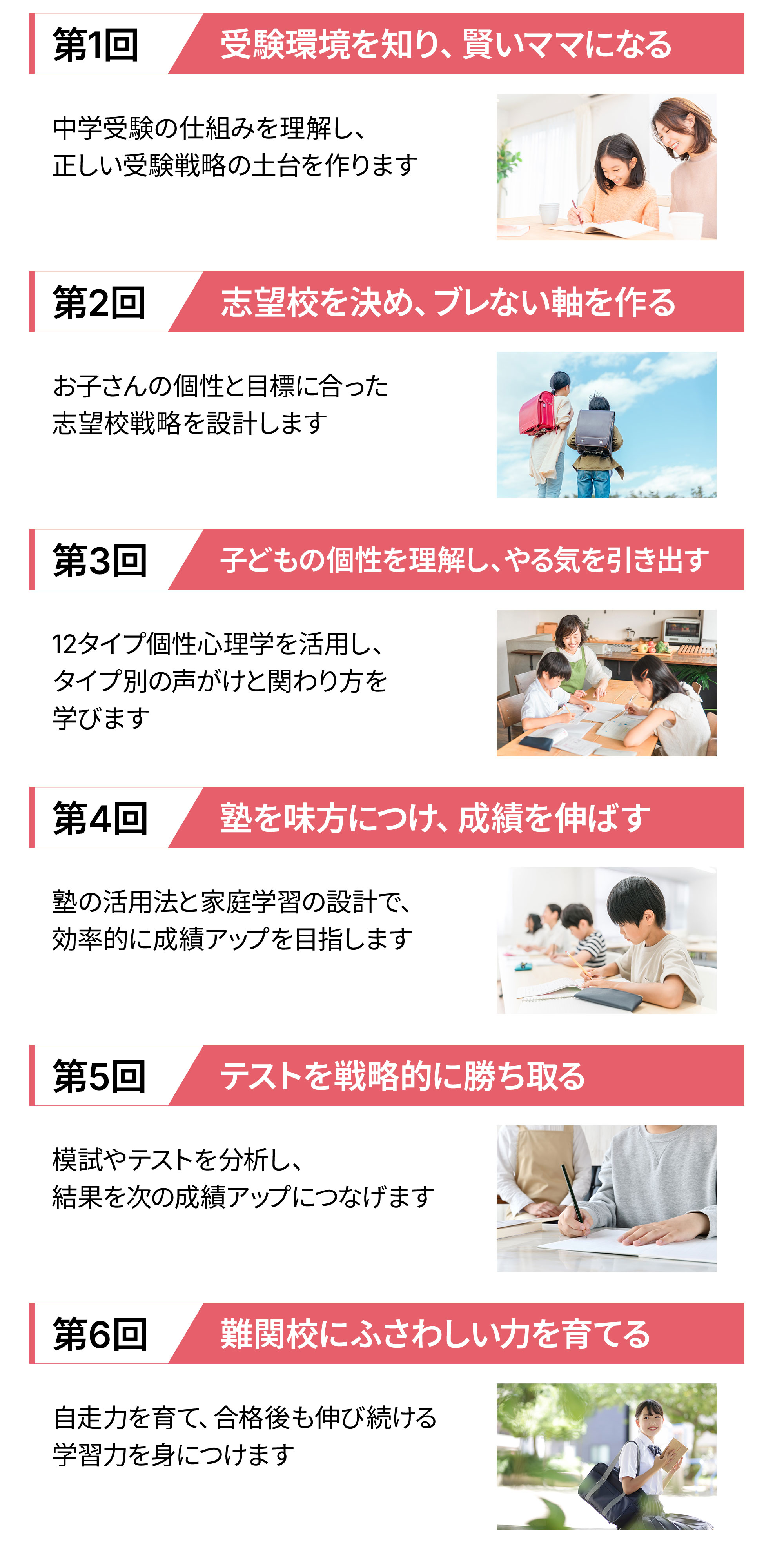 「難関中ハイレベル戦略メソッド」では、私の過去の経験を通して実践し、多くの結果も出してきた、塾は教えてくれない、信頼を深め、個性に合わせた声がけで子どもの意欲がアップし、自走力をあげる受験戦略を詳しく解説していきます。