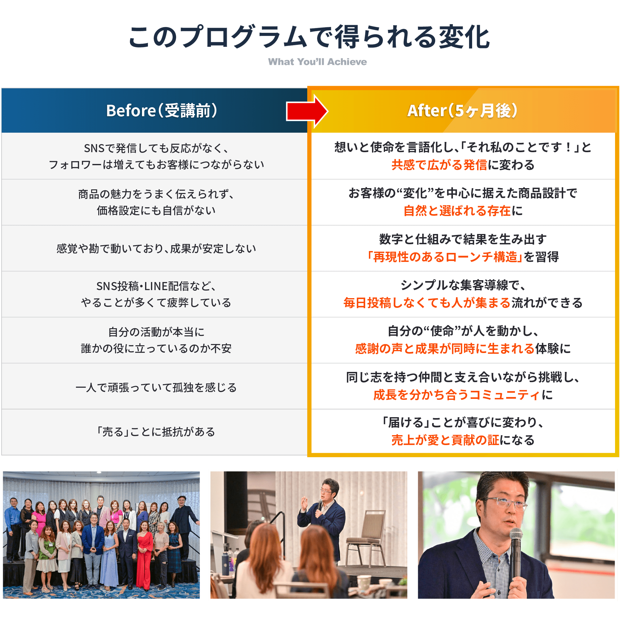 それまではSNSと個別対応だけで、届く相手が限られていましたが、ローンチを取り入れたことで“今までリーチできなかった層”の方が次々と参加してくれるように。コミュニティが広がり、紹介やJVが自然に生まれ、理想のお客様が一気に増えました。売上も3,000万円→1億円へと大きく伸び、届けられる影響力が格段に広がりました。